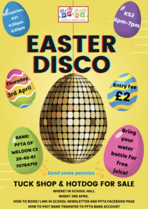 Our next fundraisers are an Easter disco on Thursday 3rd April and an Easter Tombola on Friday 4th April, watch out for posters with the full details.